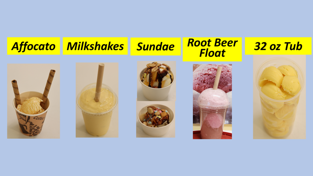 We serve gelato, sorbet, and Ice Cream there are served for the warm days, and freshly brewed coffee perfect for the cold days!